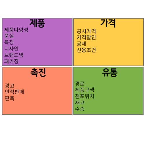 • 가격 (price): 가격은 제품을 획득한 대가로 지불해야 할 금액입니다. 가격에는 권장소매가격부터 가격할인, 보상판매, 신용조건, 가격협상을 모두 포함됩니다.
