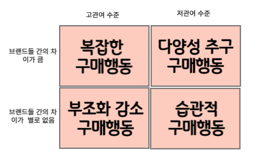 소비자의 구매행동은 복잡한 결정일 수록, 더 많은 구매참여자와 더 많은 구매의 신중함을 수반합니다. 다음은 구매자의 관여도와 브랜드 차이 정도에 따라 소비자 구매행동의 유형을 나타낸 것입니다.